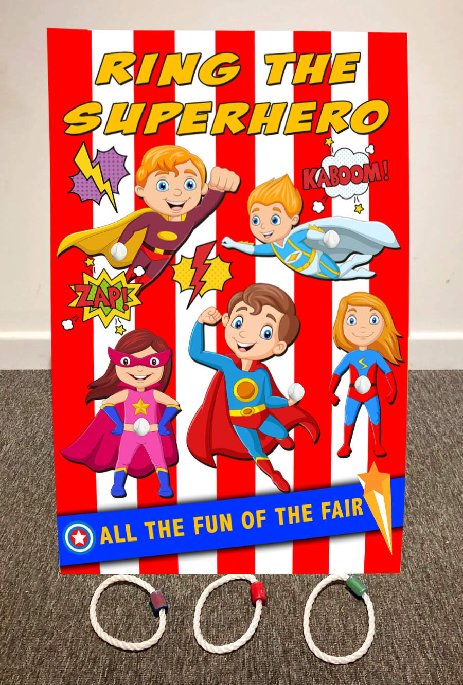 Our Super Hero Side Stall game is a new design that's unique to us. It is very similar to the fairground classic hook-a-duck game & great for all ages, a perfect attraction for all fayres, fetes, fundraising events, fun days & so much more!